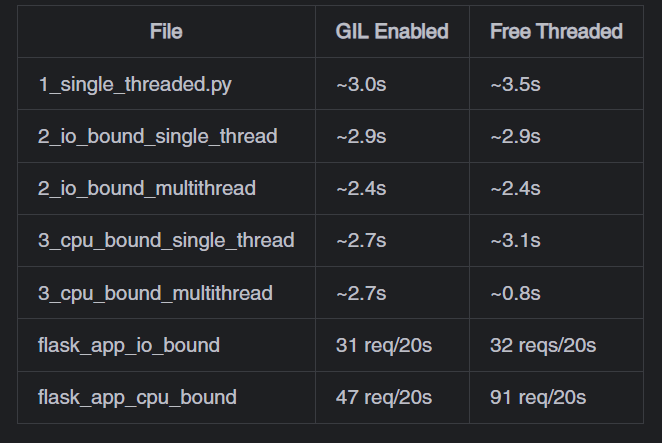 Benchmark Results: In my system, the free threaded execution was ~15% slower than default interpreter. Default interpreter completed in ~3s, while free-threaded took ~3.5s.